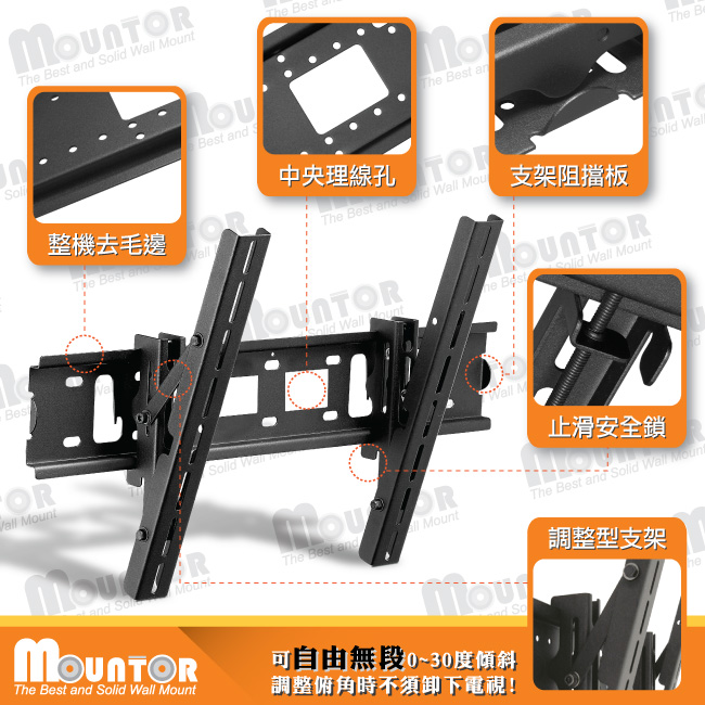 ◤調整型支架-採自由式030度俯角調整, 以關節與卡鎨固定角度,調整不用卸下電視。