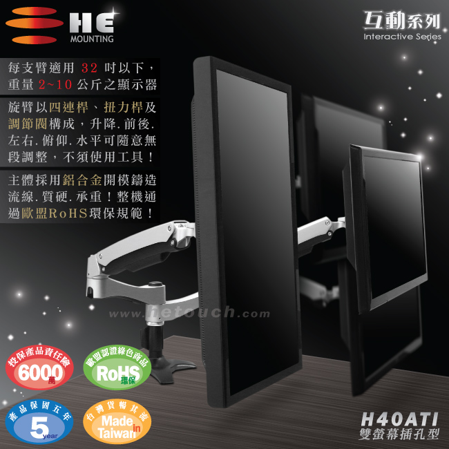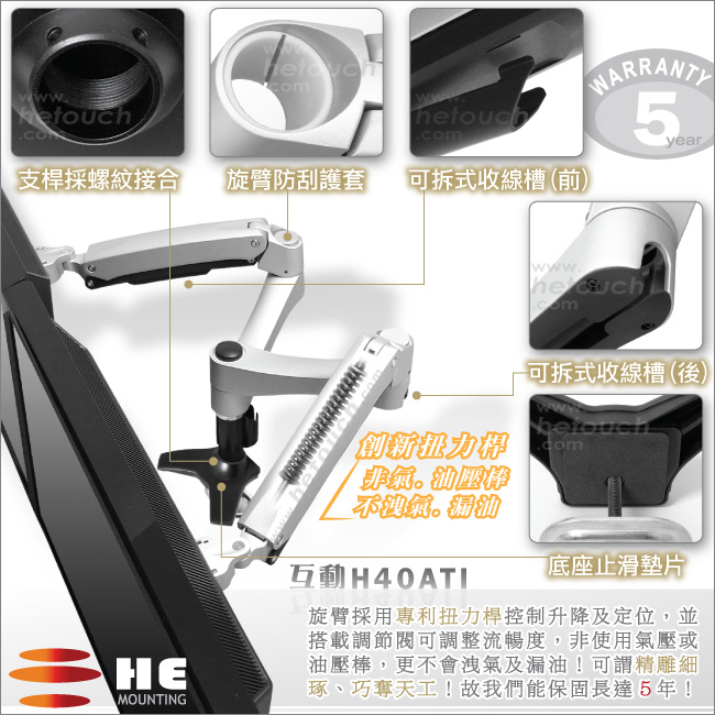 非採用氣壓或油壓棒控制升降,沒有洩氣及漏油等問題,所以裝置新一代扭力桿的旋臂,每支臂可耐重2公斤之上10公斤之下的顯示器,不會日久鬆弛、一蹶不振,故HE能提供長達5年的保固期。