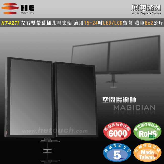 現今各大廠牌的螢幕為跟隨壁掛潮流,皆在螢幕背面預留四個壁掛專用螺絲孔,而孔與孔間的距離,則稱為孔距,由於各家螢幕設計不同,所以孔距的長寬距離都不盡相同,為免此困擾,國際VESA規範訂出多種標準孔距(10x10 / 20x10 / 20x20 / 40x20 / 60x40 / 80x40公分),但各廠商又因為顯示器大小與重量不同而使用不同的標準孔距,甚至有些製造商不跟隨VESA標準,為因應繁多的孔距,HE在此為您推出通用型多螢幕支架,除了真正通過VESA標準外,也適用於孔距長10公分/寬10公分或長7.5公分/寬7.5公分的螢幕,請您在購買本產品前測量顯示器所使用的孔距是否符合以上範圍。