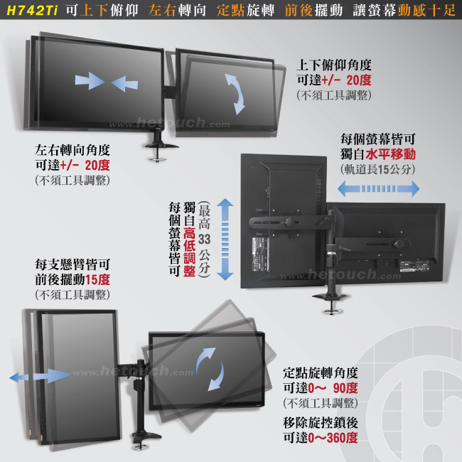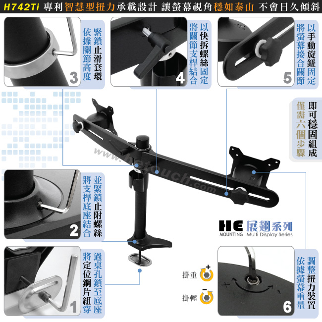 可依據螢幕重量調節扭力大小,掛重轉緊、掛輕放鬆(僅須調節一次),讓螢幕在調整各種角度時,不須任何工具或螺絲,隨轉即定位,讓視角穩如泰山、不會垂頭傾斜。