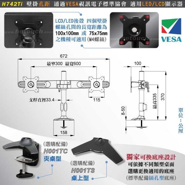 通用型!提供二種VESA孔距(10x10cm / 7.5x7.5cm)