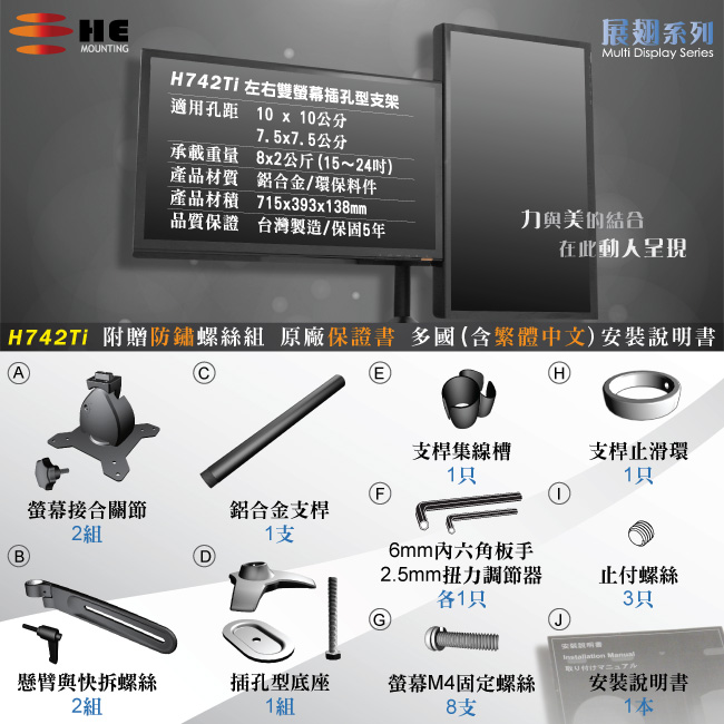 全機使用鋅鋁合金與中鋼鋼材開模鍛造,硬度、載重度與防鏽皆經過檢驗,耐重達8x2公斤,本體絕對不會變形,所以HE的產品能提供給消費者5年的保固期,保證支架在正確的使用下能歷久彌新。