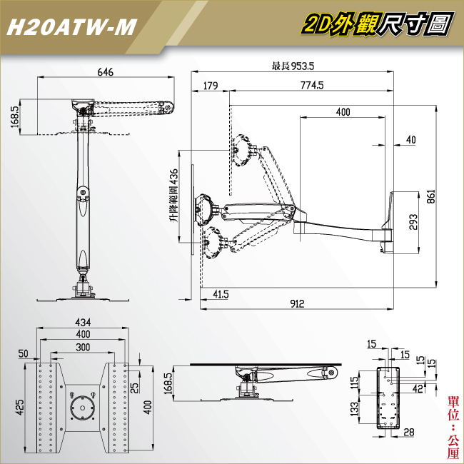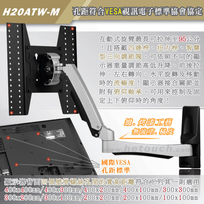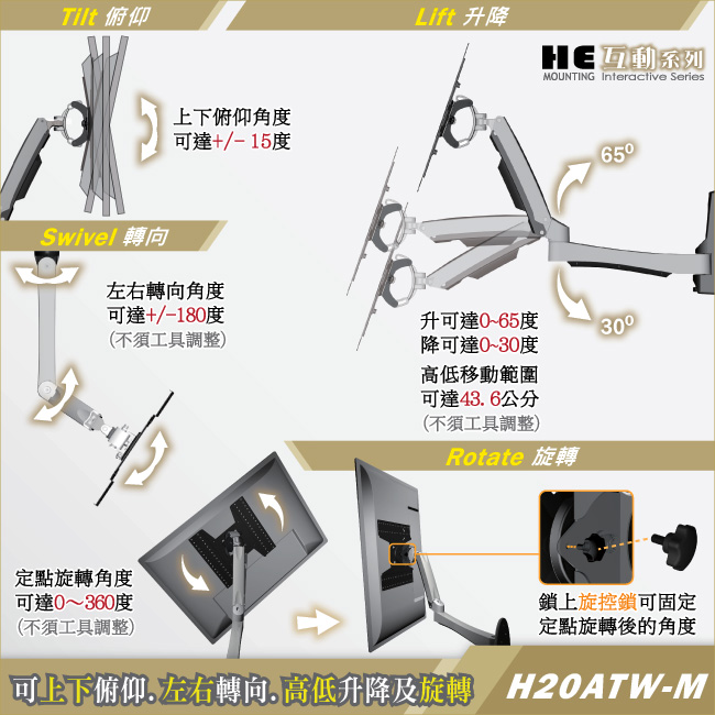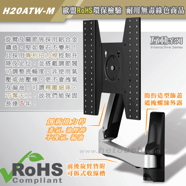 載重10~20Kg雙旋臂互動式壁掛架 - H20ATW-M