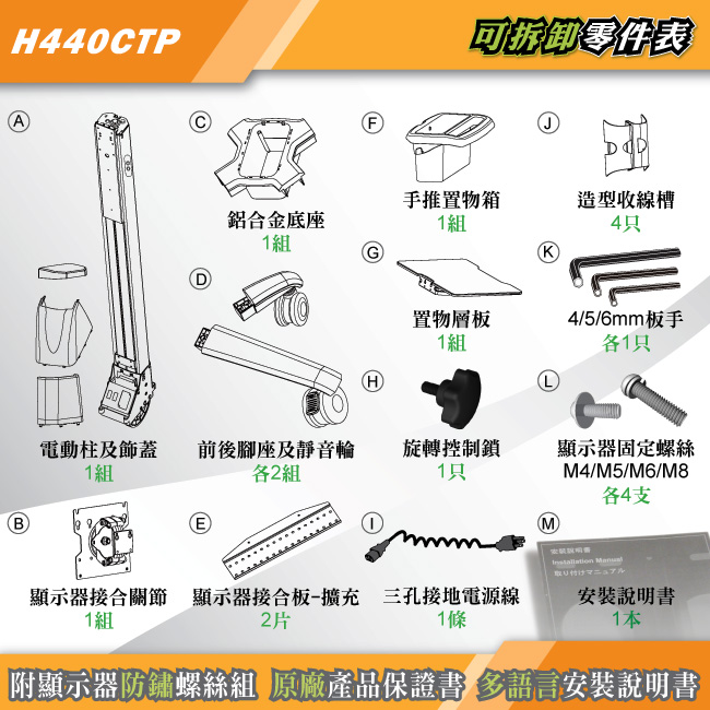 電動柱及底座皆採用鋁合金開模鑄造、一體成型,擁有外型流線、質地堅硬、主體防鏽、質量輕穎等優點;硬度、載重度與防鏽皆經過測試,本體絕對不會變形,保證推車在正確的使用下能歷久彌新。