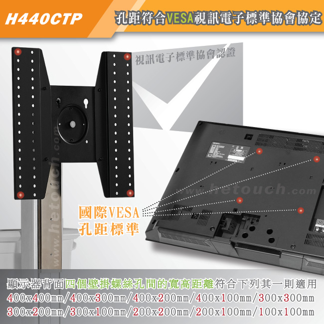 現今各大廠牌的顯示器為跟隨壁掛潮流,皆在顯示器背面預留四個壁掛專用螺絲孔,而孔與孔間的距離,則稱為孔距,由於各家顯示器設計不同,所以孔距的寬高距離都不盡相同,為免此困擾,國際VESA規範訂出多種標準孔距,但各廠商又因為顯示器大小與重量不同而使用不同的標準孔距,為因應繁多的孔距,HE在此為您推出通用型多媒體推車,適用孔距寬40公分x高40公分、寬40公分x高30公分、寬40公分x高20公分、寬40公分x高10公分、寬30公分x高30公分、寬30公分x高20公分、寬30公分x高10公分、寬20公分x高20公分、寬20公分x高10公分、寬10公分x高10公分的顯示器,請您在購買本產品前自行測量顯示器背面孔距或向顯示器廠商詢問。