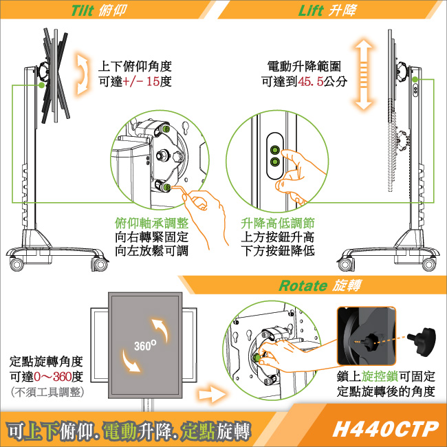 電動柱並附有俯仰軸承(隨附調整板手),可控制及固定顯示器上下俯仰的角度,讓使用者可依據不同顯示器機型,客製專屬自己並符合人體工學的視覺享受。