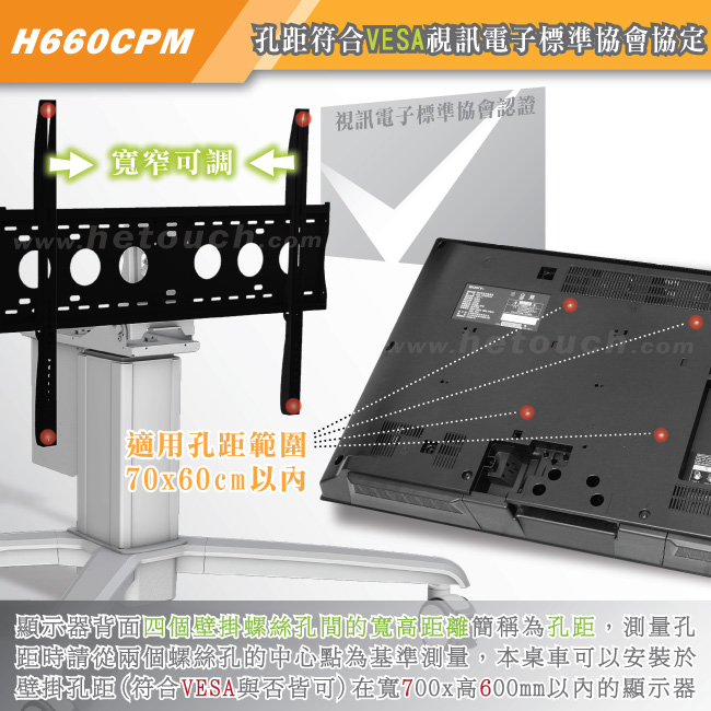 現今各大廠牌的顯示器為跟隨壁掛潮流,皆在顯示器背面預留四個壁掛專用螺絲孔,而孔與孔間的距離,則稱為孔距,由於各家顯示器設計不同,所以孔距的寬高距離都不盡相同,為免此困擾,國際VESA規範訂出多種標準孔距,但各廠商又因為顯示器大小與重量不同而使用不同的標準孔距,甚至有些製造商不跟隨VESA標準,為因應繁多的孔距,HE在此為您推出通用型桌車,除了真正通過VESA標準外,也適用於孔距寬80公分x高60公分以內的顯示器,請您在購買本產品前測量顯示器所使用的孔距是否符合以上範圍或向顯示器廠商詢問。