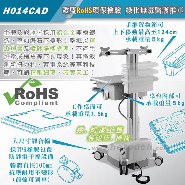 全機塗料與零件經檢驗皆通過歐盟RoHS危害性物質限制令的規範,稱之為長青、綠化料件,在此HE除了推薦您購買我們的醫療護理車,也推薦您購買真正的綠化產品。