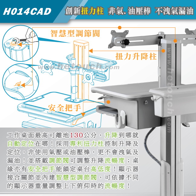 專利扭力柱搭載智慧型調節閥,可依據桌台的總載重量來調節扭力大小,載重轉緊、載輕放鬆(僅須調節一次),用以控制升降的流暢度,優點為桌台在高低升降時,不須任何工具或螺絲,僅需向上扳壓桌緣的安全把手即可調整高低度,範圍達50公分,升降到哪就自動定位在哪,隨調整即定位;鬆開安全把手後即能鎖定桌台高低,讓桌台穩如泰山、不會疲乏下垂。
