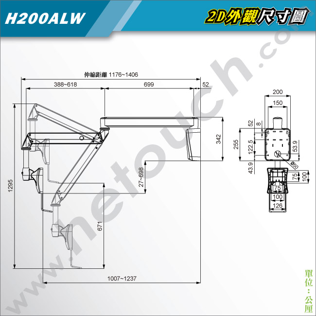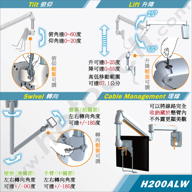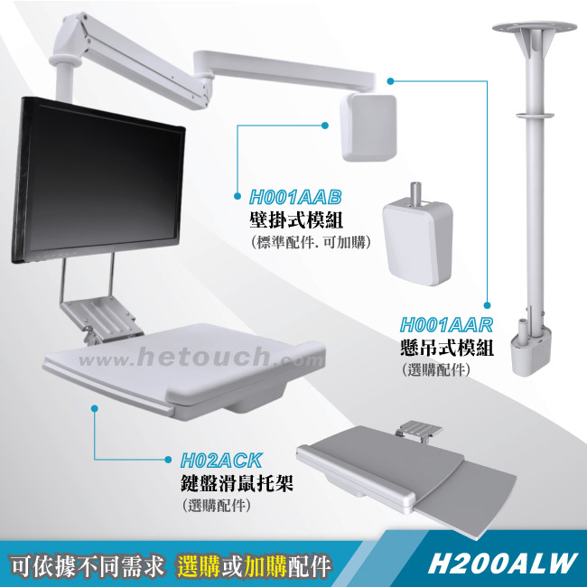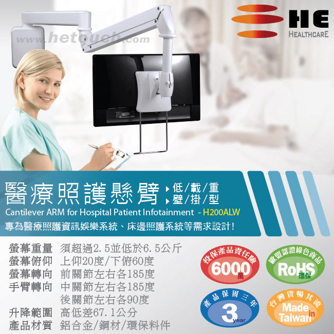 ●適用24吋以下支援VESA孔位的顯示器 ●顯示器重量須超過2.5公斤並低於6.5公斤 ●可隨意升降.前後左右移動.俯仰角度調整 ●讓病患.家屬.護理人員.臨床醫師交互使用 ●無論站著.坐著.躺著皆可舒適觀看及操作 ●三向調節閥-控制移動顯示器時的流暢度 ●懸臂保險栓-防止懸臂與顯示器意外碰撞 ●懸臂及壁掛模組可內藏線路完全不外露 ●台灣製造 / 保固3年 / 投保責任險6000萬