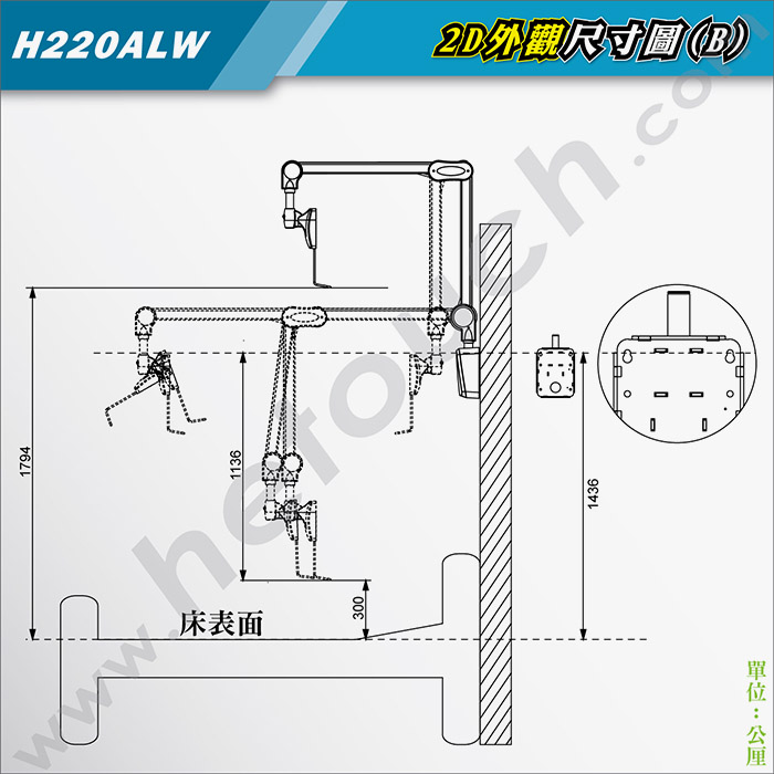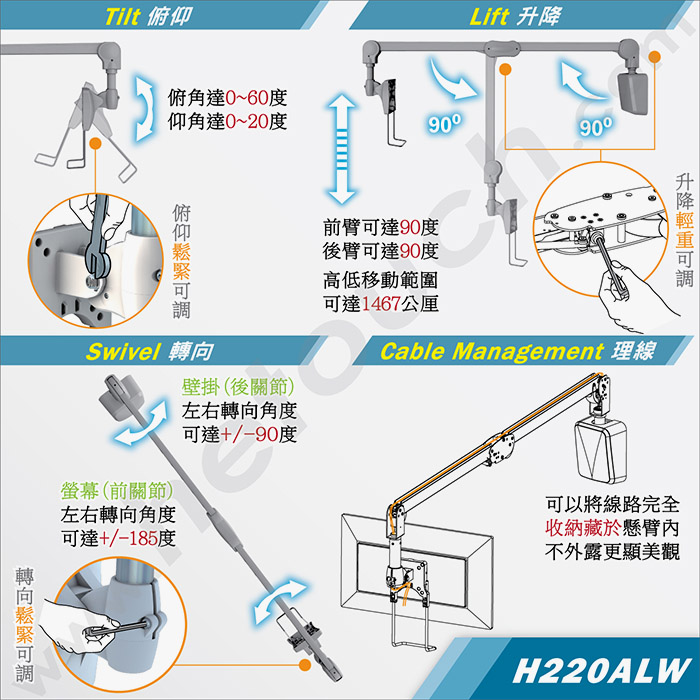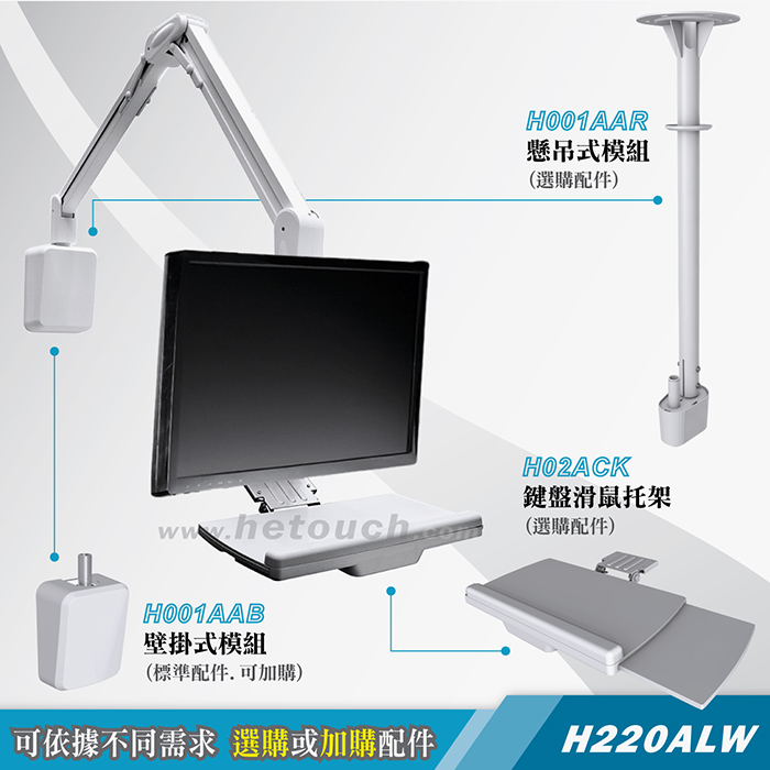●適用24吋以下支援VESA孔位的顯示器 ●顯示器重量須超過1公斤並低於6.5公斤 ●可隨意升降.前後左右移動.俯仰角度調整 ●讓病患.家屬.護理人員.臨床醫師交互使用 ●無論站著.坐著.躺著皆可舒適觀看及操作 ●三向調節閥-控制移動顯示器時的流暢度 ●懸臂及壁掛模組可內藏線路完全不外露 ●台灣製造 / 保固3年 / 投保責任險6000萬