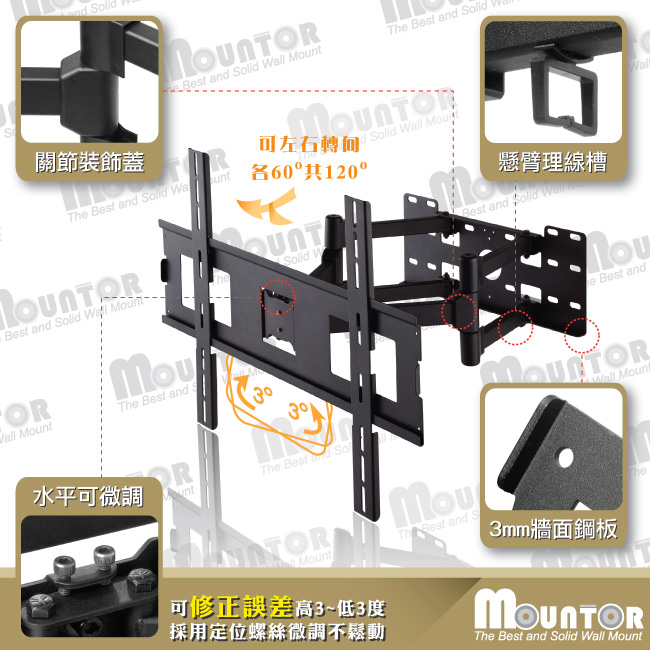 ◤牆面固定座-採用厚3公厘的中鋼鋼板製作,故能承受四倍以上前端載重量(60x4公斤)。