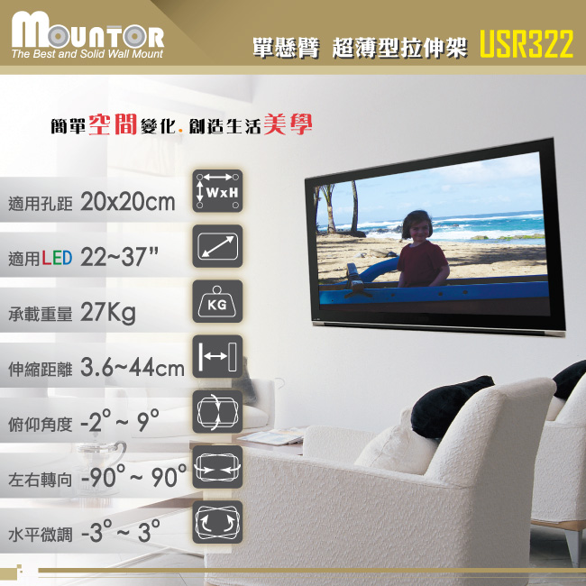 ◤三叉型懸臂-可拉伸至44.7公分,收回時僅厚3.6公分,三叉型堅固設計,無斷裂之虞。