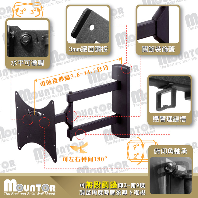 ◤牆面固定座-採用厚3公厘的中鋼鋼板製作,故能承受四倍以上前端載重量(27x4公斤)。