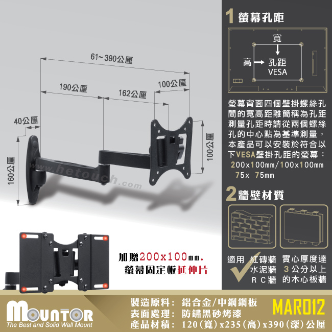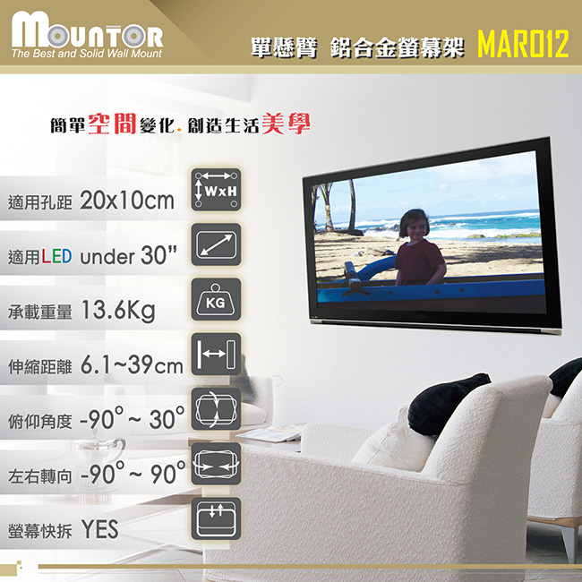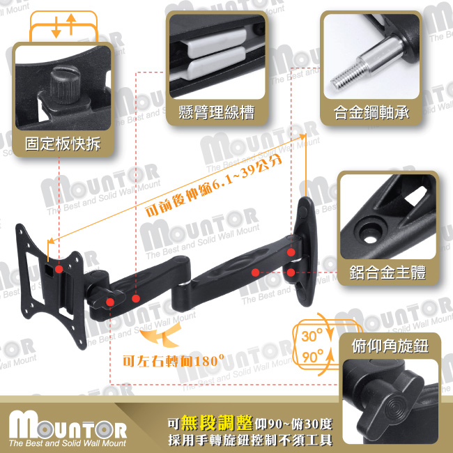 ◤鋁合金主體-可拉伸至39公分,收回時厚6.1公分,鋁合金造型懸臂及牆座,堅硬耐用。