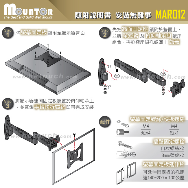 ◤固定板快拆-螢幕連同固定板可快速拆裝,與懸臂結合或分離時,採用手轉螺絲不須工具。