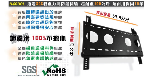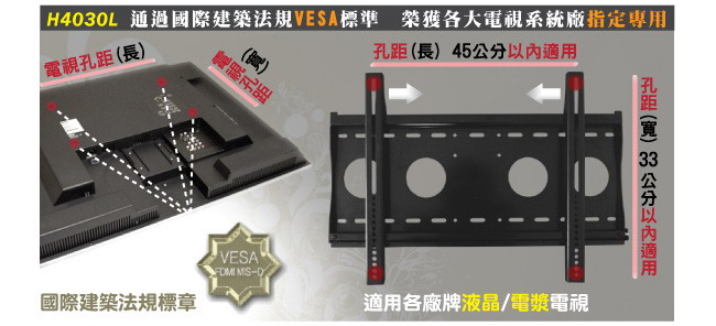 出通用型壁掛架H4030L,除了真正通過VESA標準外,也適用於孔距長45公分/寬33公分以內的電視,請