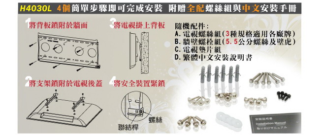 隨機附上繁體中文安裝說明書,讓您清楚的了解正確的壁掛架安裝步驟,省卻找師傅安裝的昂貴費用!