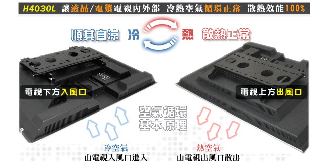 出,而下側的開孔則是為了讓冷空氣流入,這樣的基本空氣循環原理,是在電視的內部執行,和壁掛架