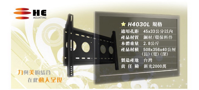 重的電視,不堪一摔! 所以HE堅持以消費者的安全性為優先考量,推薦您這一款H4030L壁掛架!