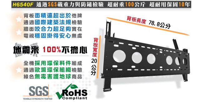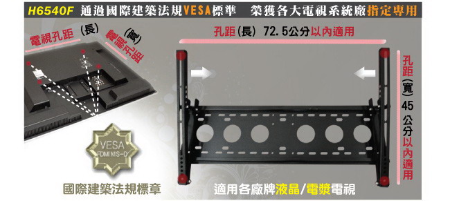 出通用型壁掛架H6540F,除了真正通過VESA標準外,也適用於孔距長72.5公分/寬45公分以內的電視,