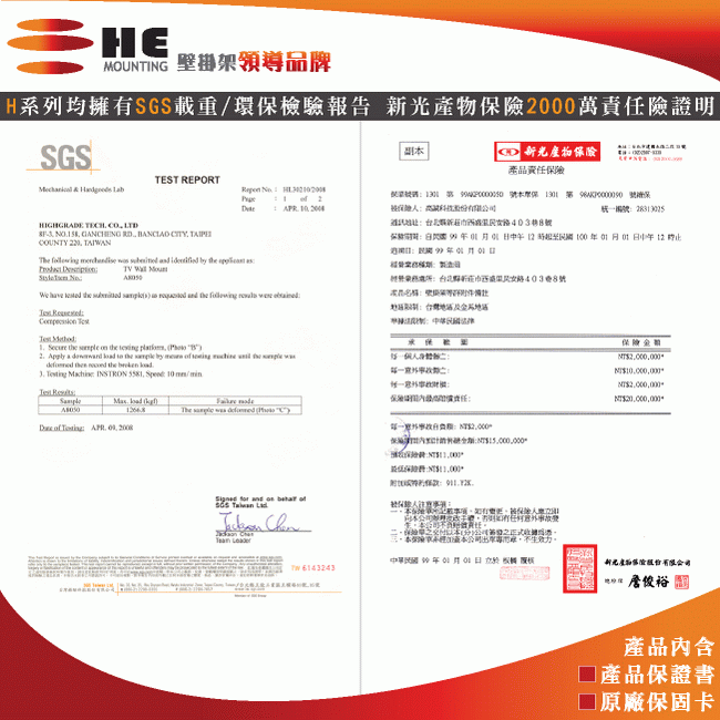 載重100公斤、保固10年、新光產品責任險2000萬