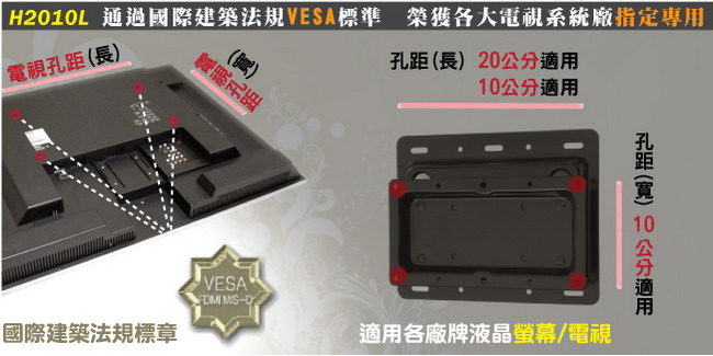 用型壁掛架H2010L,除了真正通過VESA標準外,也適用於孔距長20公分/寬10公分或長10公分/寬10公分