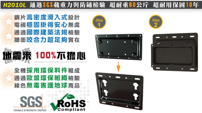 H2010L的電視固定板與牆面固定板採用厚度2mm的中鋼鋼材製造,搭配高密度滑入式設計,結合後絕不