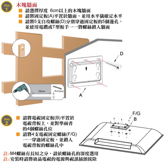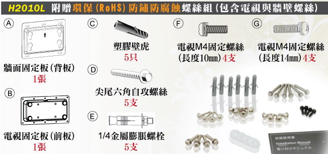 隨機附贈2種規格M4(10mm) /M4(14mm)的電視螺絲,可適用於各廠牌的電視,因為HE的壁掛架為多家液