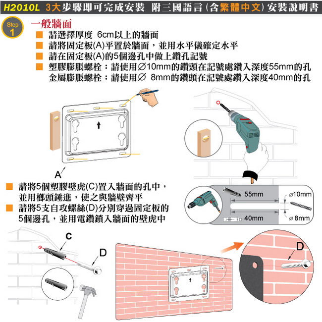 屬膨脹螺栓組,讓您依據不同的牆面材質或日後牆壁復原的難易度(使用塑膠壁虎,日後牆面復原較容易)