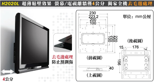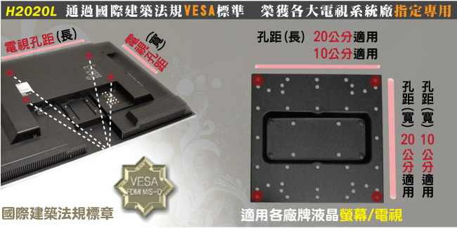 用型壁掛架H2020L,除了真正通過VESA標準外,也適用於孔距長20公分/寬20公分