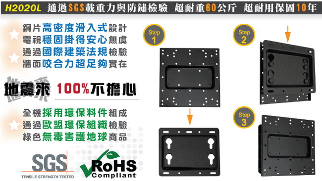 H2020L的電視固定板與牆面固定板採用厚度2mm的中鋼鋼材製造,搭配高密度滑入式設計,結合後絕不