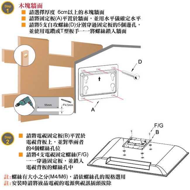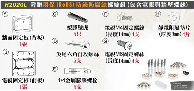 隨機附贈2種規格M4(14mm) /M6(14mm)的電視螺絲,可適用於各廠牌的電視,因為HE的壁掛架為多家液