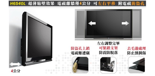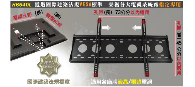 出通用型壁掛架H6540L,除了真正通過VESA標準外,也適用於孔距長73公分/寬45公分以內的電視,請