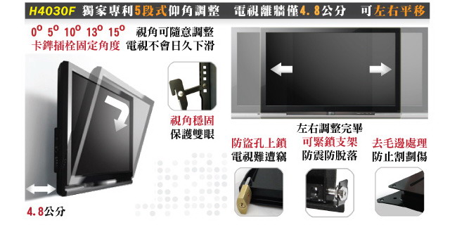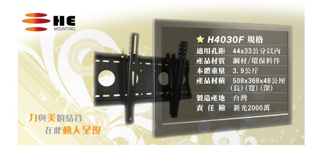 重的電視,不堪一摔! 所以HE堅持以消費者的安全性為優先考量,推薦您這一款H4030F壁掛架!