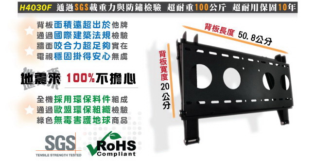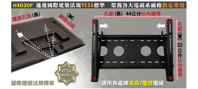 出通用型壁掛架H4030F,除了真正通過VESA標準外,也適用於孔距長44公分/寬33公分以內的電視,請