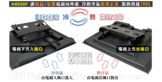 出,而下側的開孔則是為了讓冷空氣流入,這樣的基本空氣循環原理,是在電視的內部執行,和壁掛架