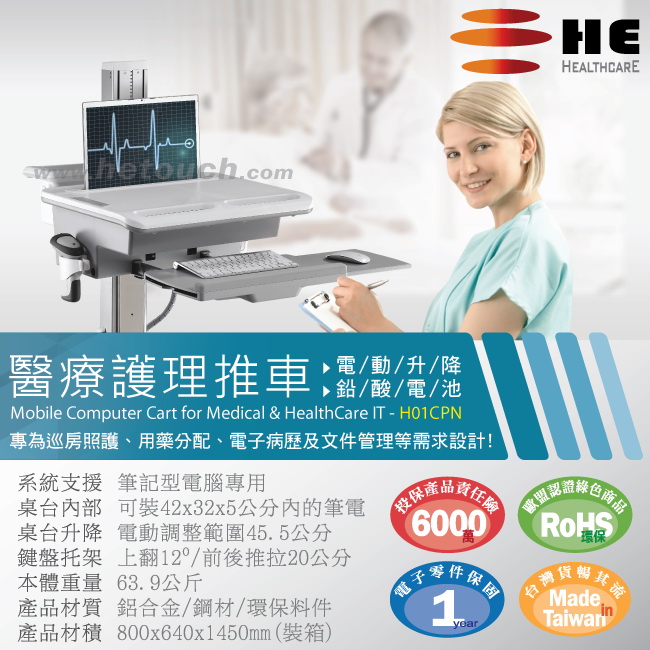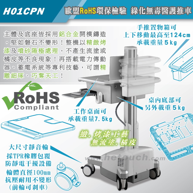 全機塗料與零件經檢驗皆通過歐盟RoHS危害性物質限制令的規範,稱之為長青、綠化料件,在此HE除了推薦您購買我們的醫療護理車,也推薦您購買真正的綠化產品。