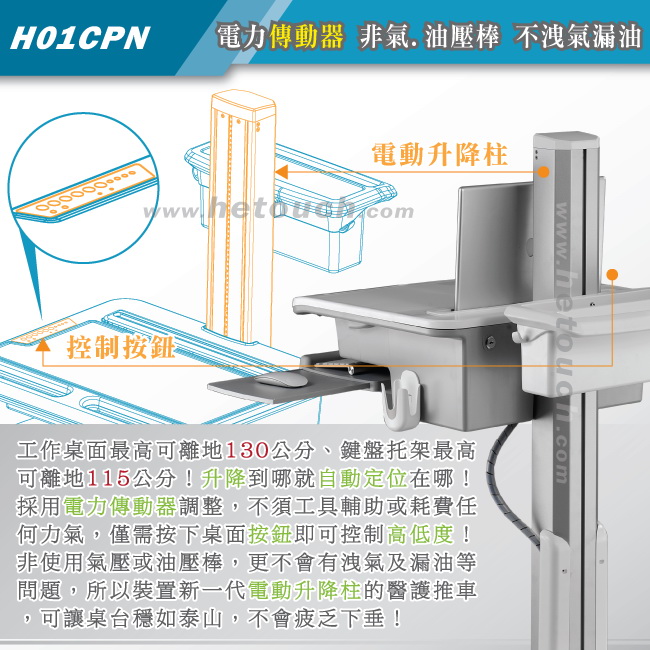 電動柱及底座皆採用鋁合金開模鑄造、一體成型,擁有外型流線、質地堅硬、主體防鏽、質量輕穎等優點;硬度、載重度與防鏽皆經過測試,本體絕對不會變形,保證醫療護理車在正確的使用下能歷久彌新。