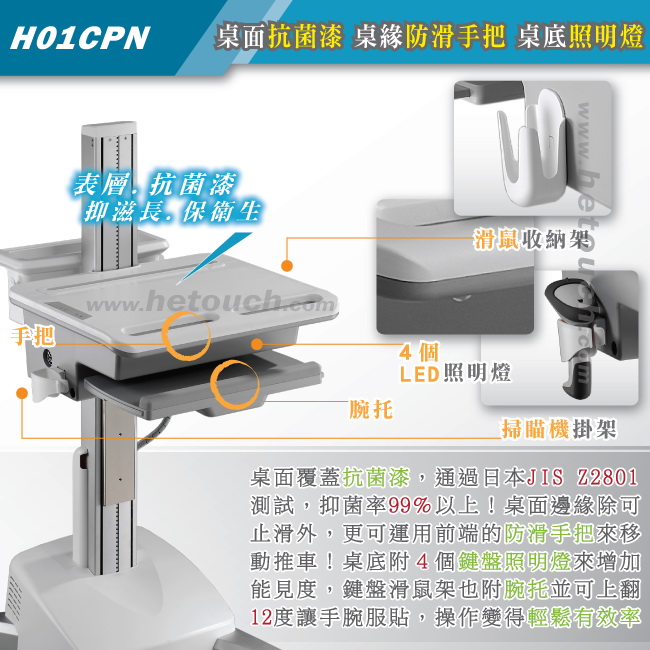 桌面覆蓋具有抑菌滋長的抗菌漆,經SGS以日本工業標準JIS Z2801方式檢驗,針對金黃色葡萄球菌、大腸桿菌測試,抑菌率達99%以上,可確保醫療護理環境的衛生。