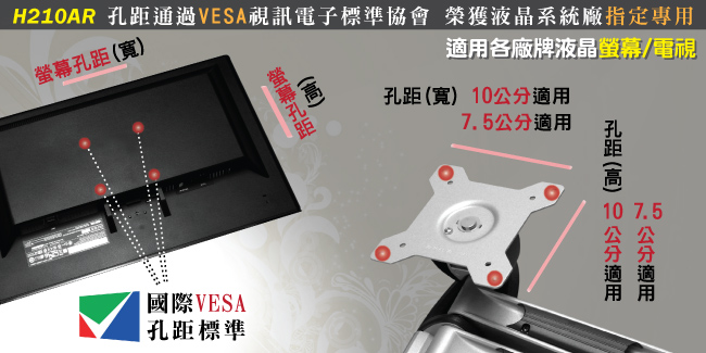 通用型!提供二種VESA孔距(10x10cm / 7.5x7.5cm)