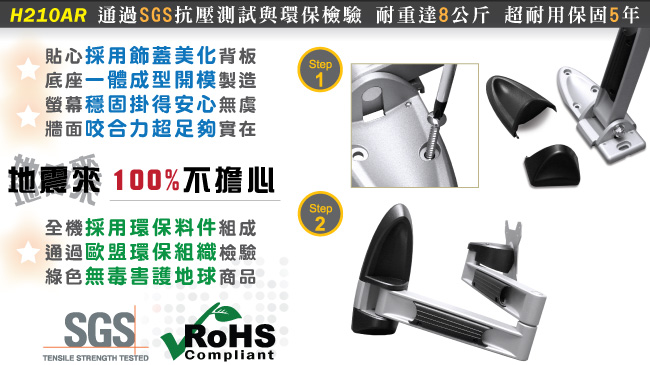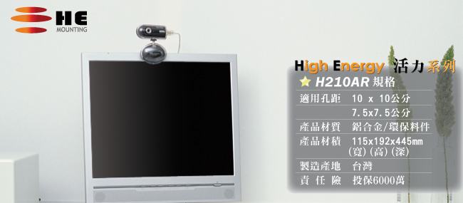 使用鋅鋁合金與中鋼鋼材開模煉製,硬度與載重度皆經過國際SGS組織的載重力與防鏽檢驗,耐重達8公斤,本體絕對不會變形,而機身採用鋅鋁合金及防鏽烤漆,所以HE的產品能提供給消費者5年的保固期,保證壁掛架在正確的使用下能歷久彌新。
