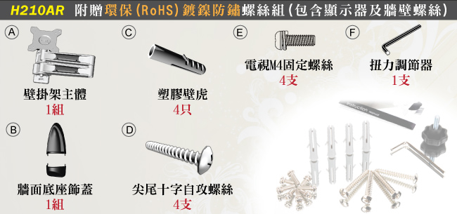 隨機附贈牆壁螺栓組,可使用於水泥、磚牆等一般牆面,另外自攻螺絲也可單獨使用於木塊牆面,以上牆面皆可讓背板緊貼,保護您與府上顯示器的安全,HE壁掛架的高安全性無人能敵,讓您沒有想換壁掛架的困擾。