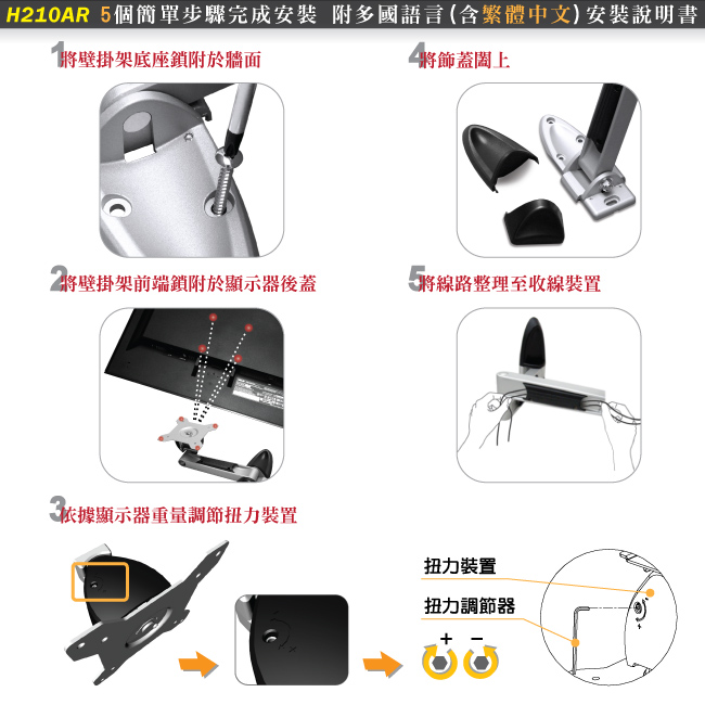 ◎隨機附上繁體中文安裝說明書,讓您清楚的了解正確的壁掛架安裝步驟,省卻找師傅安裝的昂貴費用!