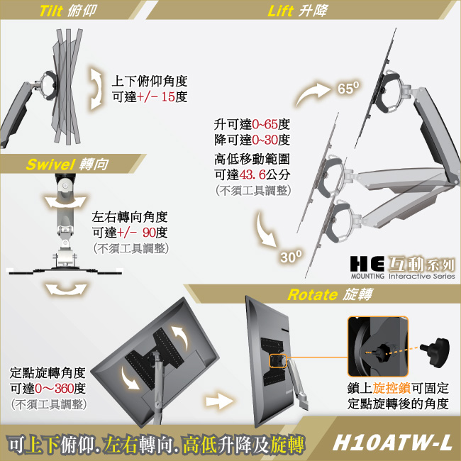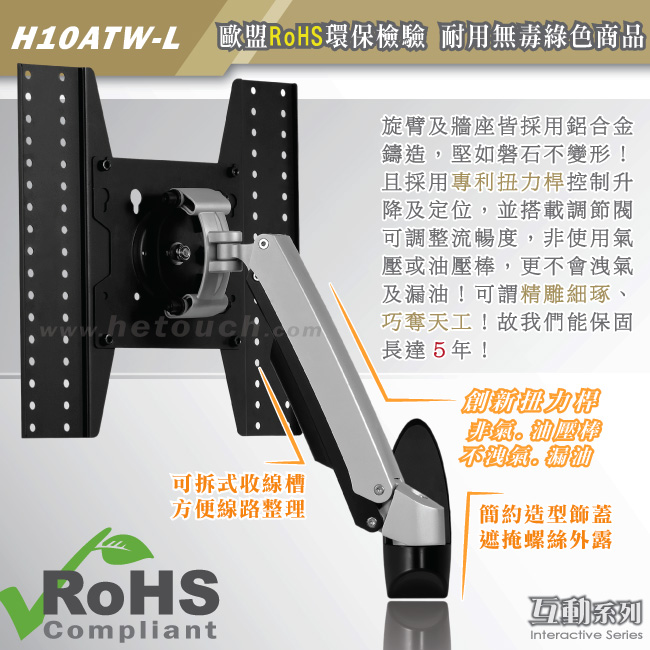 非採用氣壓或油壓棒控制升降,沒有洩氣及漏油等問題,所以裝置新一代扭力桿的旋臂,可耐重20公斤以上30公斤以下的顯示器,不會日久鬆弛、一蹶不振,故HE能提供長達5年的保固期。