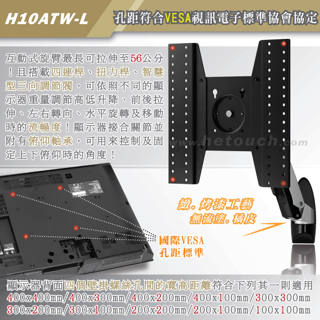 現今各大廠牌的顯示器為跟隨壁掛潮流,皆在顯示器背面預留四個壁掛專用螺絲孔,而孔與孔間的距離,則稱為孔距,由於各家顯示器設計不同,所以孔距的寬高距離都不盡相同,為免此困擾,國際VESA規範訂出多種標準孔距,但各廠商又因為顯示器大小與重量不同而使用不同的標準孔距,為因應繁多的孔距,HE在此為您推出通用型互動式壁掛架,適用孔距寬40公分x高40公分、寬40公分x高30公分、寬40公分x高20公分、寬40公分x高10公分、寬30公分x高30公分、寬30公分x高20公分、寬30公分x高10公分、寬20公分x高20公分、寬20公分x高10公分、寬10公分x高10公分的顯示器,請您在購買本產品前自行測量顯示器背面孔距或向顯示器廠商詢問。