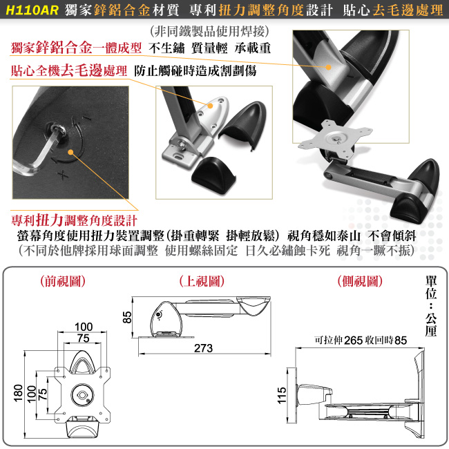 32"以下單旋臂鋁合金拉伸架.螢幕架 - H110AR