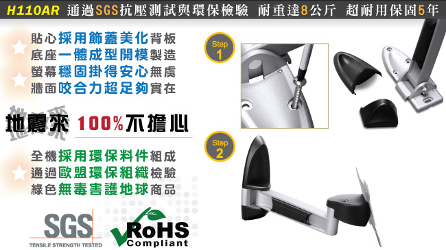 全機塗料與零件皆經過歐盟RoHS環保組織檢驗,稱之為長青料件、綠色商品,在此HE除了推薦您購買我們的壁掛架,也推薦您購買現在正夯的綠色商品。