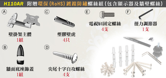 隨機附贈牆壁螺栓組,可使用於水泥、磚牆等一般牆面,另外自攻螺絲也可單獨使用於木塊牆面,以上牆面皆可讓背板緊貼,保護您與府上顯示器的安全,HE壁掛架的高安全性無人能敵,讓您沒有想換壁掛架的困擾。