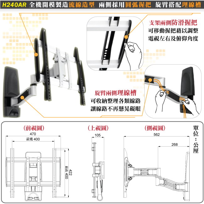 通用型壁掛架H240AR,除了真正通過VESA標準外,也適用於孔距長40公分/寬40公分以內的電視,請您